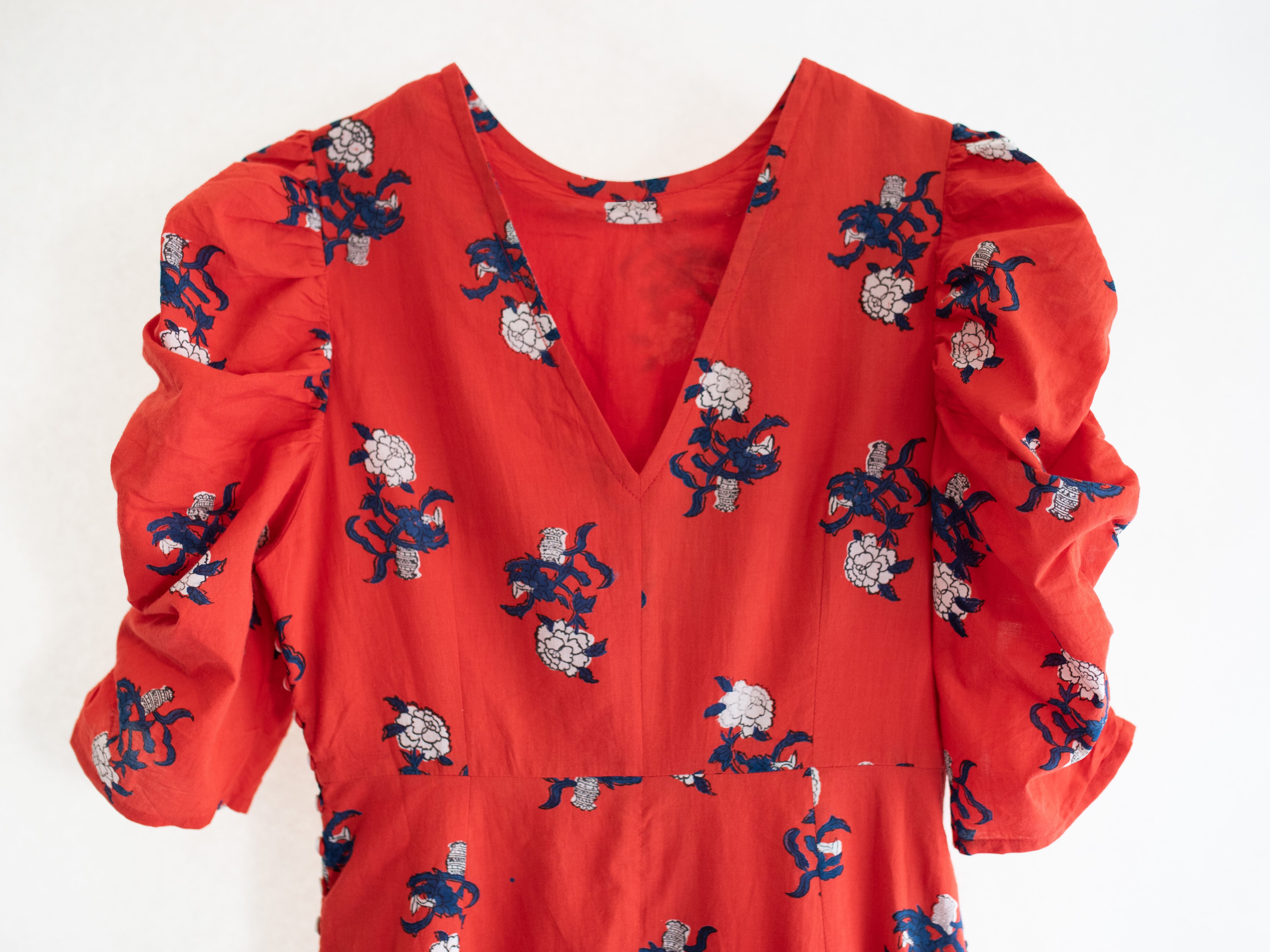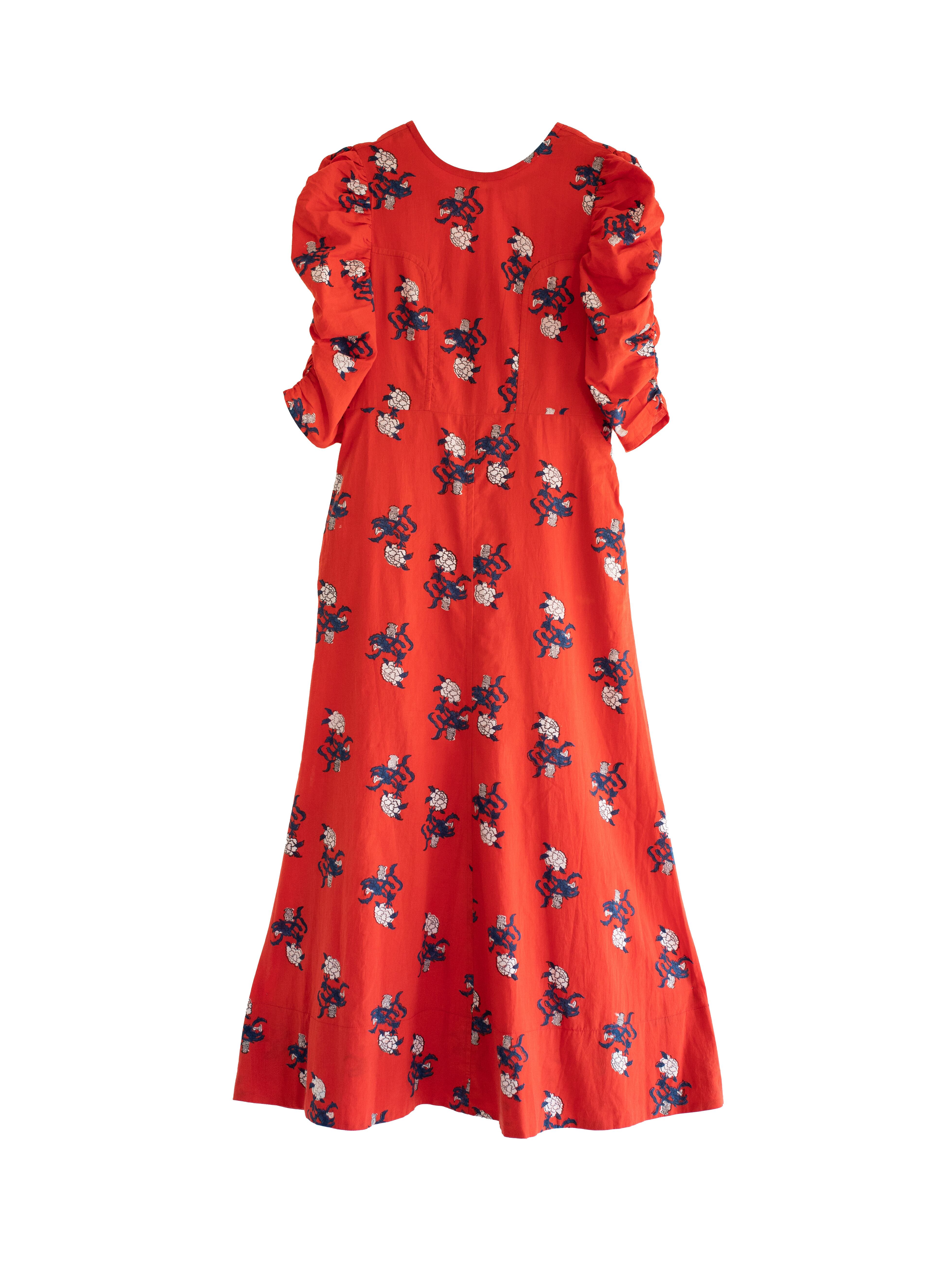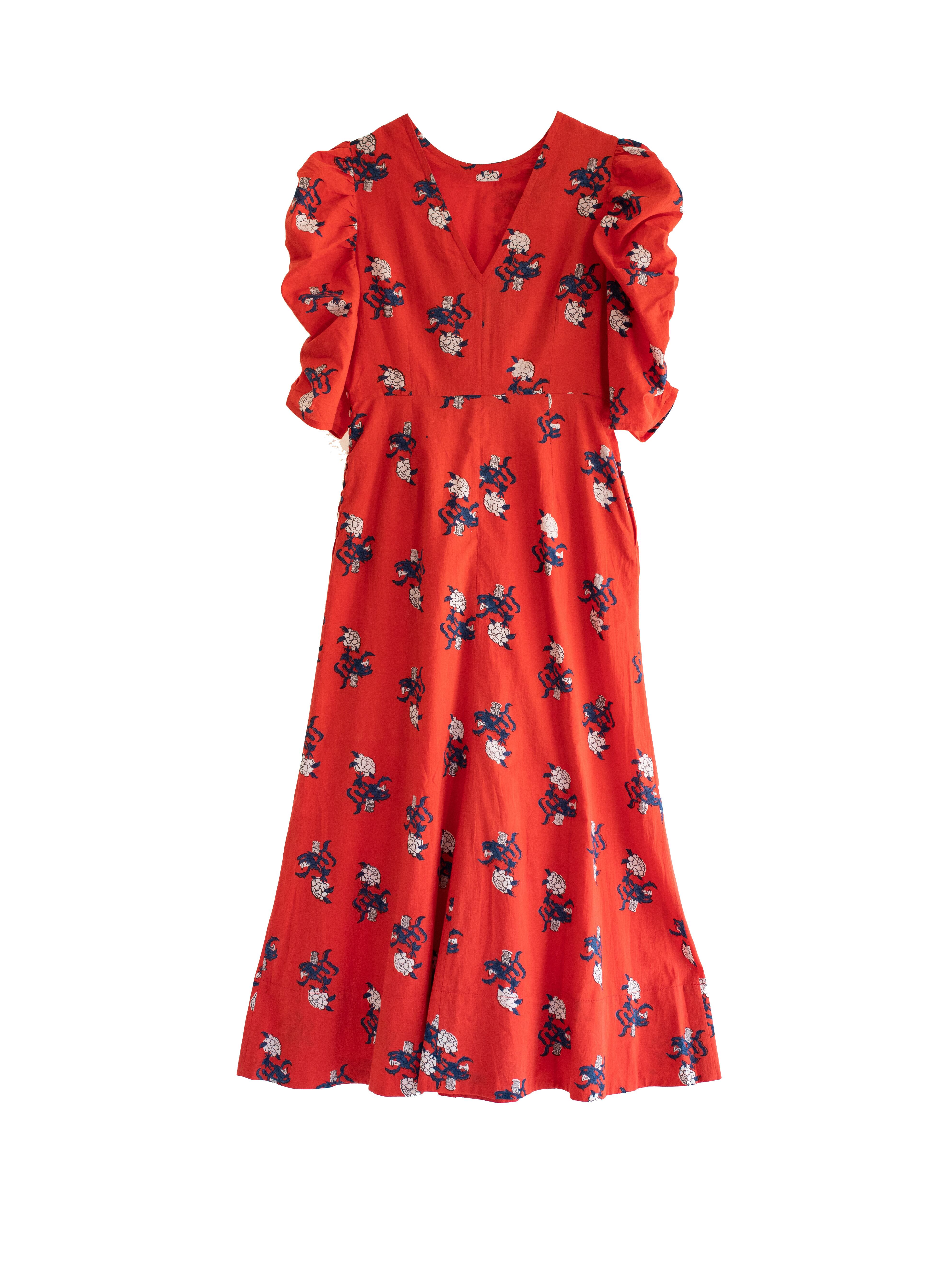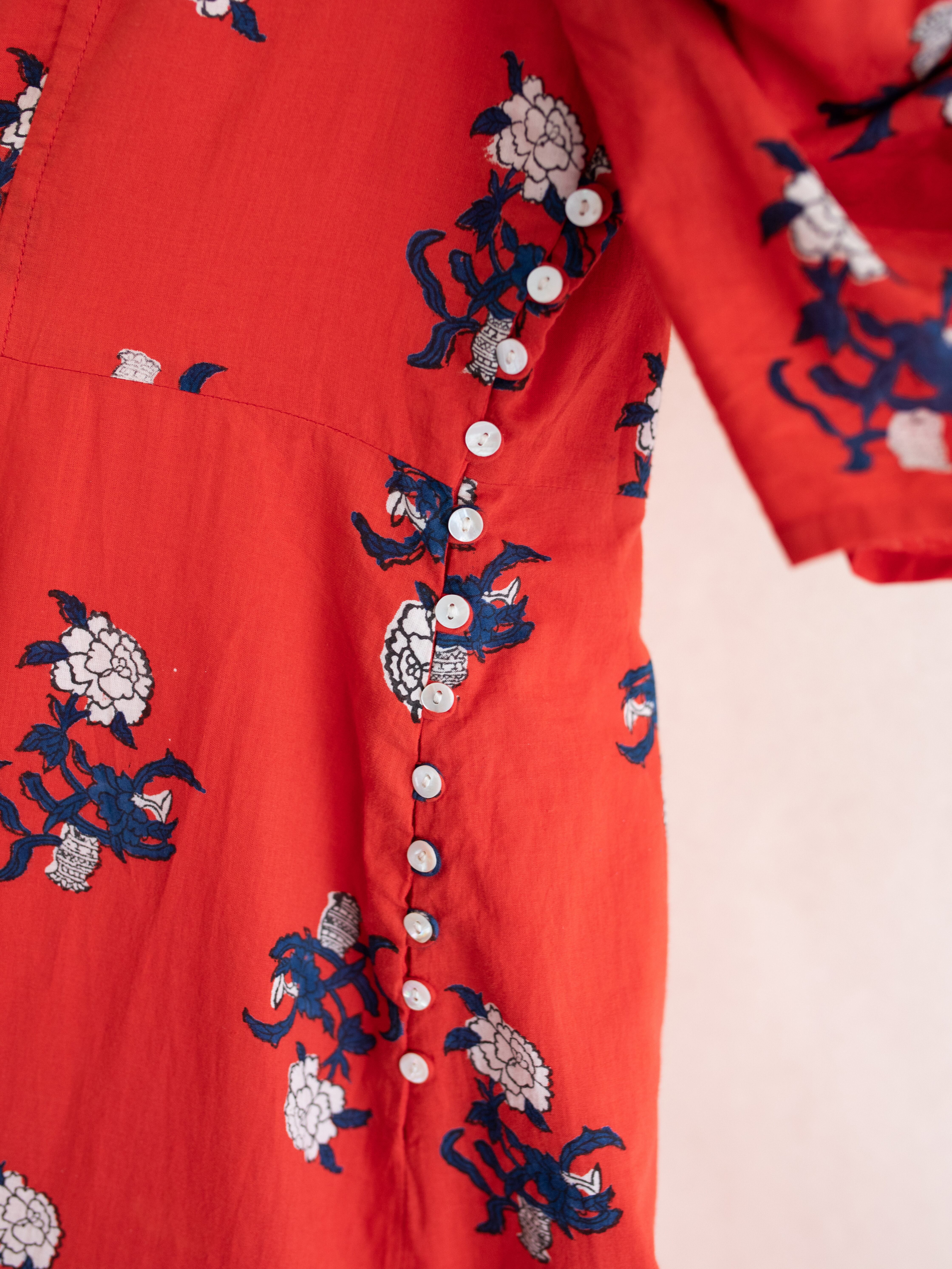 中国のアンティークの衣装からインスパイアされた鮮やかな赤に白いフラワーモチーフが映えるプリントデザイン。